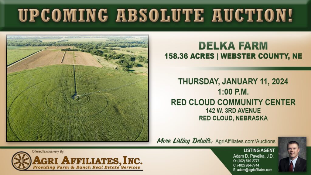 Join us Thursday, January 11, 2024 at 1:00 PM CST for a absolute land auction of the Delka Farm. 158.36 acres in Webster County, Nebraska, offered in two parcels!