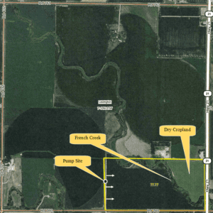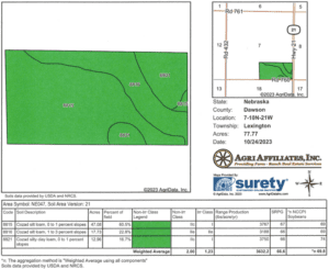 Dawson County Assessor indicated a total of 77.77 tax-assessed acres. Farm consists of gravity-irrigated cropland with dry crop located adjacent to the heavily-wooded French Creek.